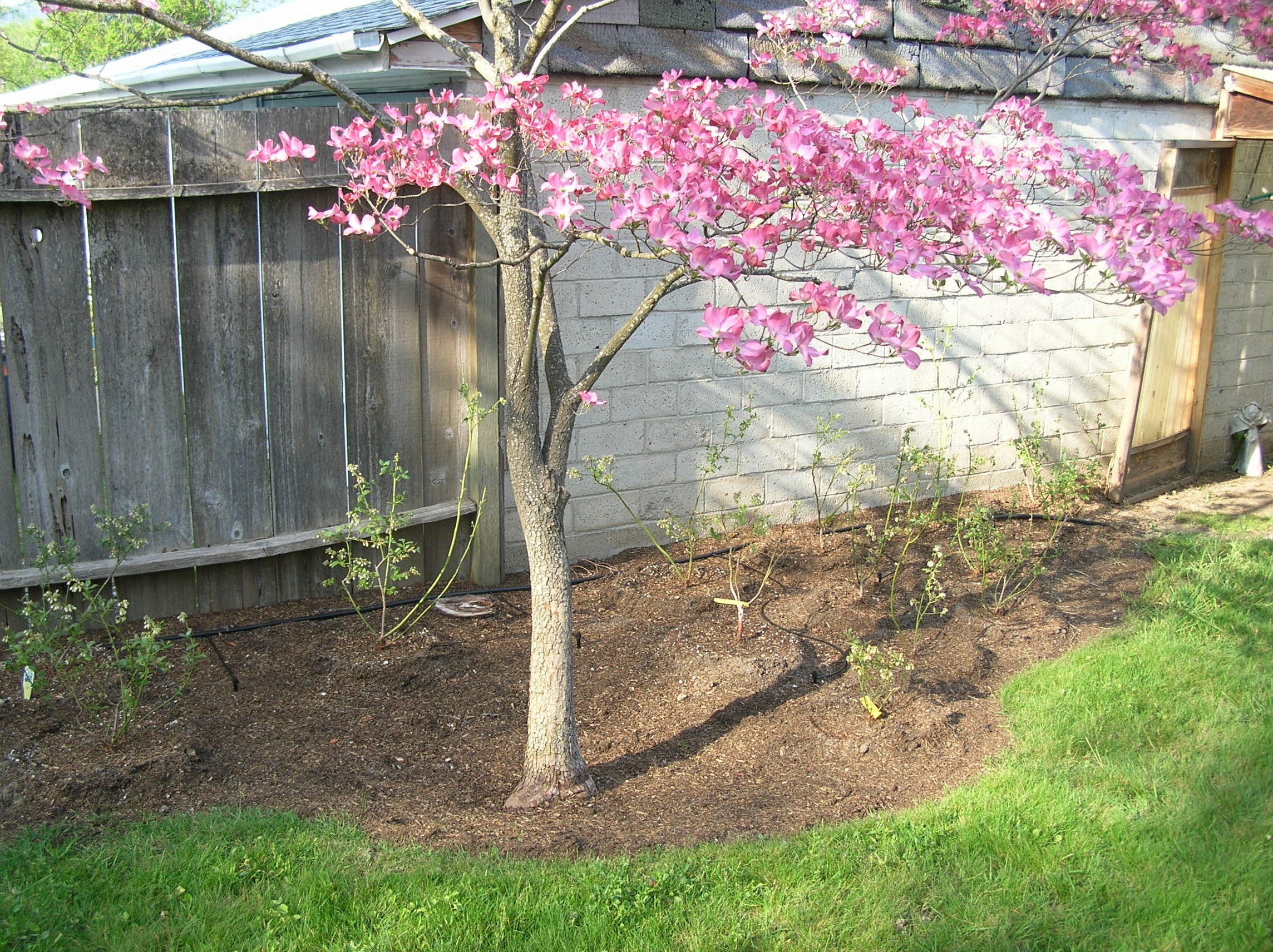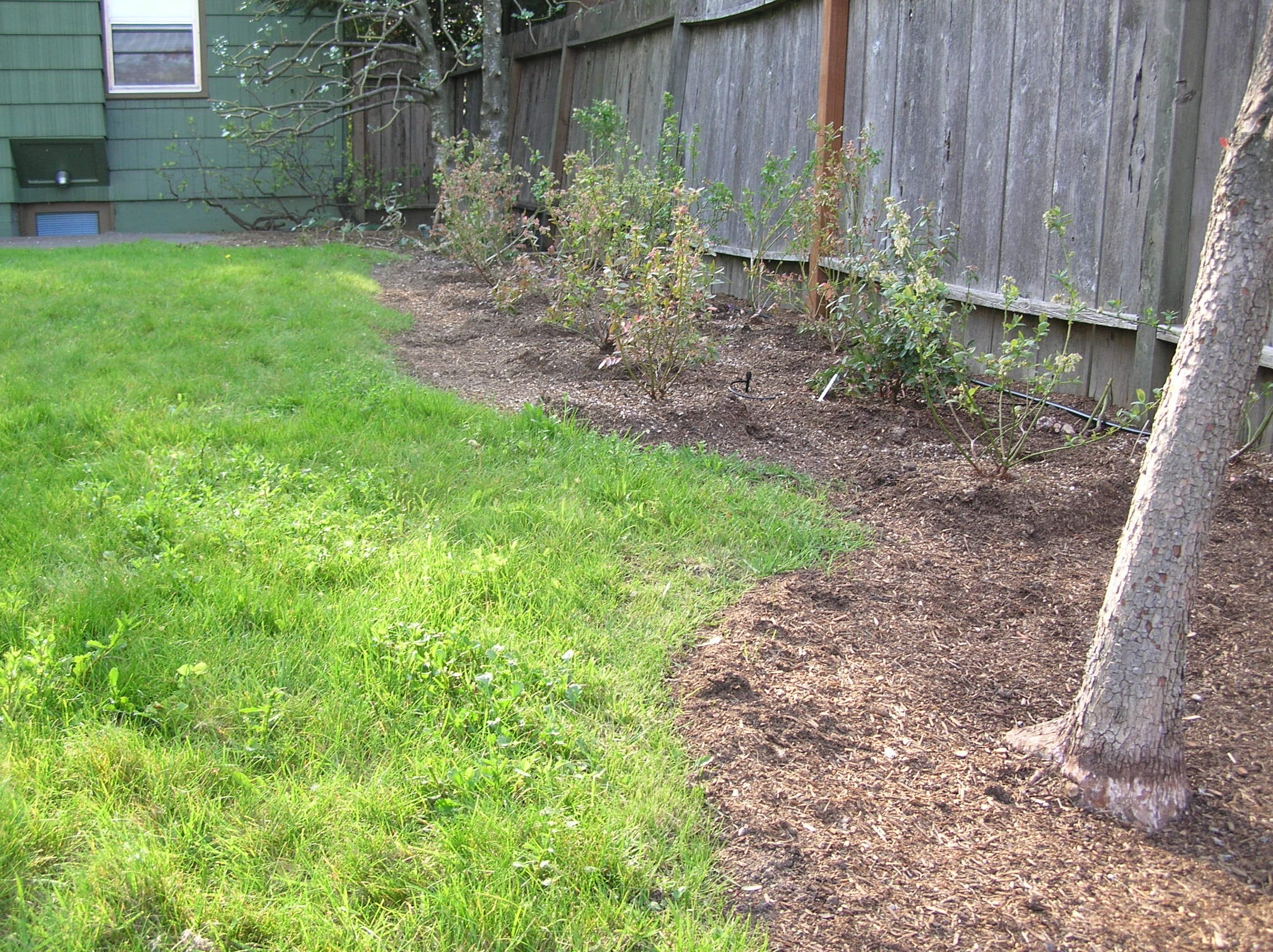 Water them in thoroughly. Blueberries require a lot of water, and right when you plant a shrub it is important to keep those roots moist until the plant has clearly shown you it is rooting and happy. You can tell this by gently shaking the plant. The root base should not come out of the soil easily.