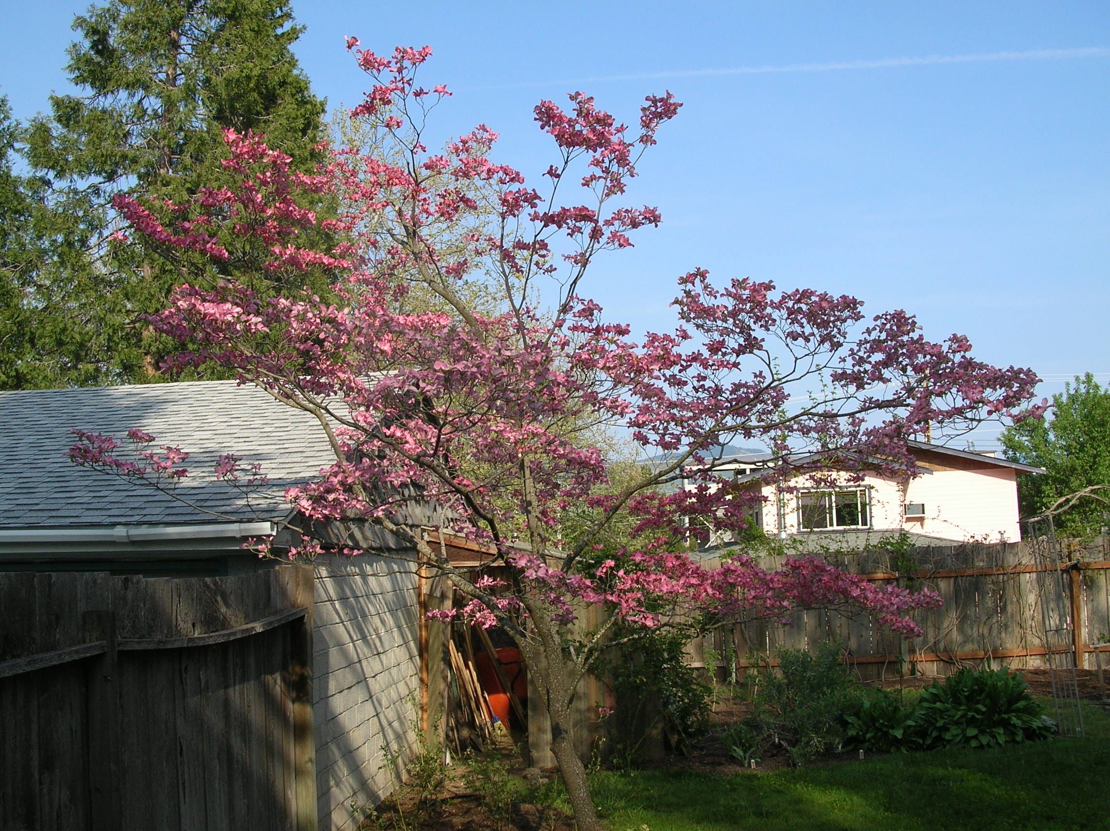 -- Check for signs of disease and pull off any moss as you are working your way to the top. The crab-apple tree above and the pink flowering dogwood tree to the right are great examples of how a tree should look after being pruned.